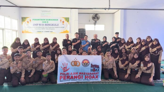 Bengkulu, Investigasi News – Guna membentengi generasi muda dari dampak negatif penyebaran informasi palsu di era digital, Bidang Hubungan Masyarakat (Bidhumas) Polda Bengkulu menggelar kegiatan Sosialisasi Bahaya Berita Hoaks di SMP Negeri 1 Kota Bengkulu.23 Juli 2925