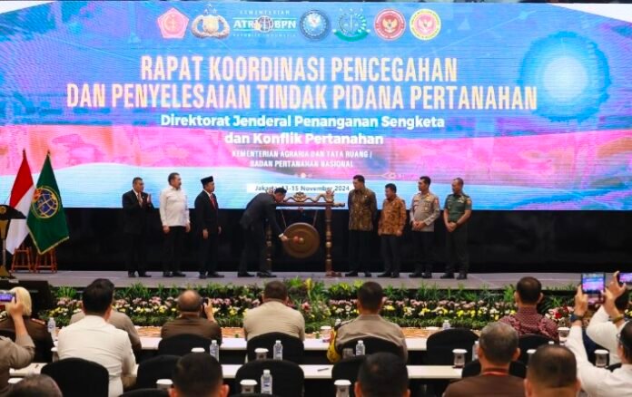 Jakarta, avantia.my.id – Menteri Koordinator Bidang Infrastruktur dan Pembangunan Kewilayahan, Agus Harimurti Yudhoyono (AHY) membuka Rapat Koordinasi (Rakor) Penyelesaian Tindak Pidana Pertanahan Tahun 2024 yang ditandai dengan pemukulan gong pada Kamis (14/11/2024), di Grand Mercure Kemayoran, Jakarta. Dalam sambutannya, Menko AHY menyampaikan bahwa Kementerian Agraria dan Tata Ruang/Badan Pertanahan Nasional (ATR/BPN) menunjukkan komitmen menyelesaikan persoalan pertanahan, dengan tidak tebang pilih dalam proses penyelesaiannya.
