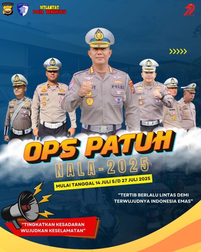 Bengkulu, investigasi.news – Polda Bengkulu mengerahkan 314 personel untuk melaksanakan Operasi Patuh Nala 2025, yang akan berlangsung selama 14 hari, mulai tanggal 14 hingga 27 Juli 2025. Apel Gelar Pasukan Operasi Patuh Nala 2025 dipimpin oleh Kapolda Bengkulu, Irjen Pol Mardiyono, S.I.K., M.Si., di Lapangan Anton Soedjarwo Polda Bengkulu.
